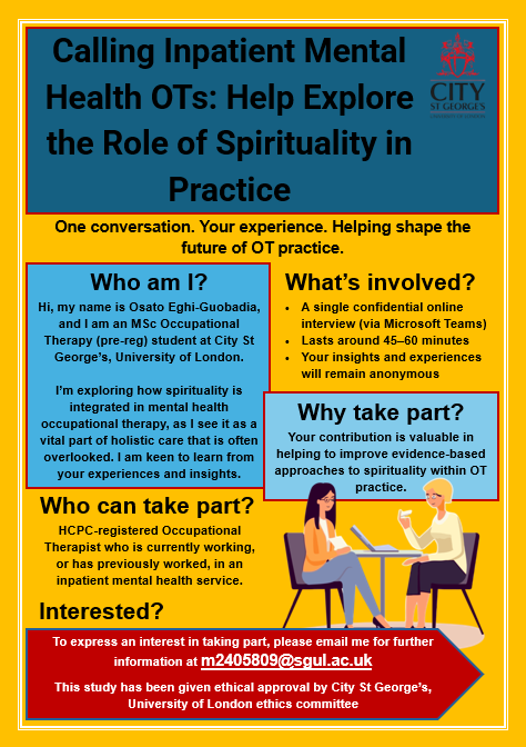 I am conducting a research study as part of my MSc Occupational Therapy degree at City St George’s, University of London, exploring the experiences of inpatient mental health Occupational Therapists integrating spirituality into their practice.
